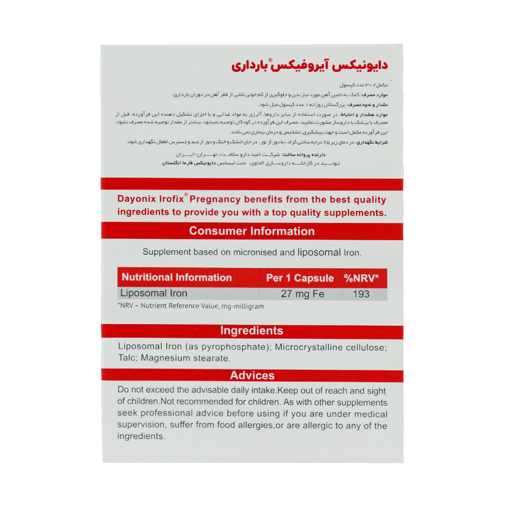 کپسول آیروفیکس بارداری دایونیکس فارما یک مکمل آهن پیشرفته و ویژه برای بانوان باردار است که به شکل کپسول و در بستههای 30 عددی عرضه میشود. این محصول حاوی 27 میلی گرم آهن لیپوزومال است که به تامین آهن مورد نیاز بدن، پیشگیری و درمان کم خونی ناشی از فقر آهن کمک میکند و از عوارضی مانند خستگی، ضعف و کاهش اکسیژن رسانی به بدن مادر و جنین جلوگیری میکند. فرم آهن موجود در این مکمل به صورت لیپوزومال بوده که هم به افزایش جذب آهن کمک کرده و هم عوارض گوارشی را به حداقل رسانده است. این مکمل تحت لیسانس شرکت دایونیکس فارما انگلستان و در کارخانه داروسازی الحاوی در ایران تولید و بسته بندی میشود.